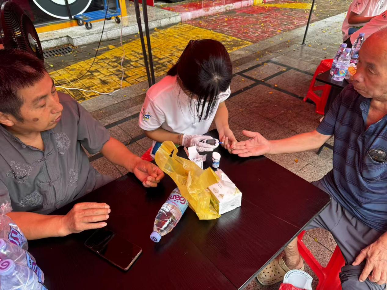1.血糖监测区:指尖微采,五秒出数。“还青禾”队员们用通俗易懂的语言解释专业术语,根据检测结果提供个性化的健康建议,引导居民了解血糖水平的重要性,帮助居民更好地掌握自身健康状况。