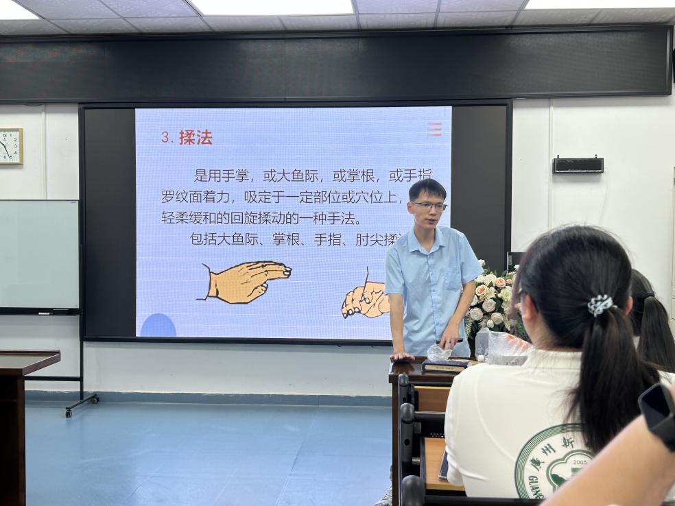 在下午的强化训练中,王程灵老师结合专业知识,对上午讲述的中医理疗内容进行了补充完善,并针对研究群体,带领突击队成员们学习清肺拍拍操和分辨如大椎、足三里、风门等老年慢性支气管炎相关的艾灸部位。同时,王程灵老师还对突击队在三下乡过程中主要运用的相关技能进行了一对一的培训和实践,保障突击队成员对人体穴位的熟练和理疗技能的纯熟,力求在三下乡过程中给每位需要帮助的老人带来最贴心、最符合自身的服务。