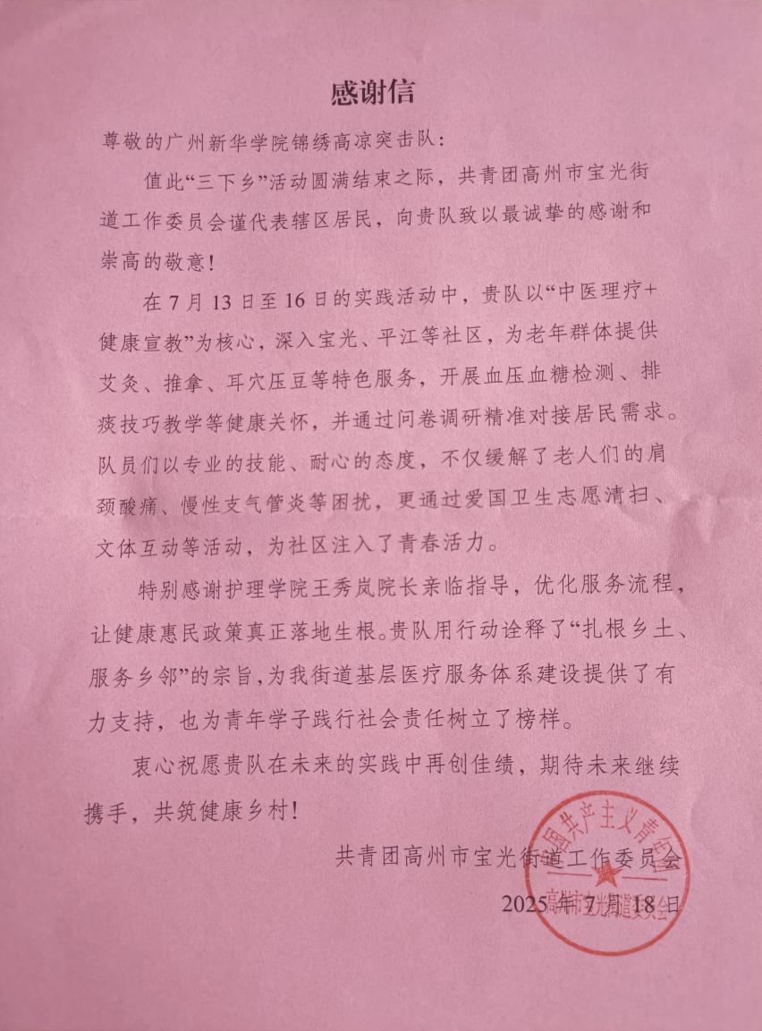 在党的二十大关于全面推进乡村振兴的战略指引下,为深入贯彻医疗资源下沉基层、提升农村康养服务水平的重要部署,7月18日,广州新华学院锦绣高凉社会突击队(以下简称“突击队”)前往高州市宝光街道北江社区进行健康服务活动,并前往宝光街道办事处(以下简称“办事处”)采访办事处团委书记开展感恩致谢与深度交流,共商合作路径,携手绘就“中西医结合,助力乡村”的崭新画卷。