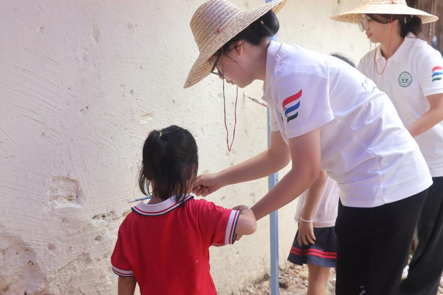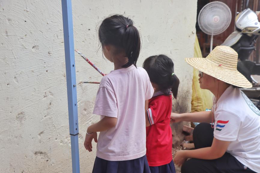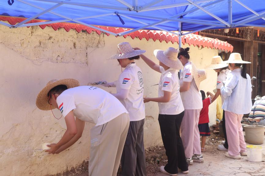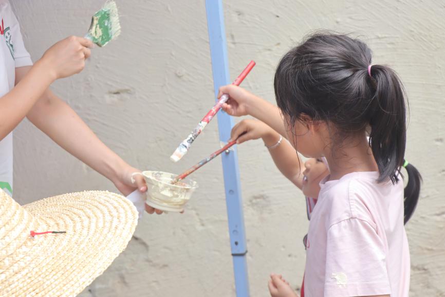 墙绘过程中,当地的孩子们被吸引而来,渴望参与墙绘体验。队员们热情地带着孩子们一起绘画,耐心解答他们的问题。孩子们的欢声笑语为墙绘工作注入了更多活力与欢乐。