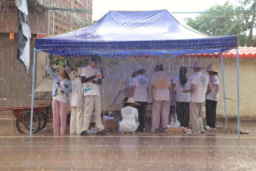 工作进行中,天空突降骤雨,墙绘工作被迫暂停。但队员们毫不气馁,待雨势停歇,便迅速重整旗鼓,再次投入工作。雨后天气闷热,汗水不断浸湿队员们的衣衫,可没有一人喊累。大家累了就稍作休息、喝点水,接着又拿起画笔继续创作。在大家的齐心协力下,墙绘工作快速推进,初见成效。看着逐渐成型的墙面,队员们脸上露出了自豪的笑容。
