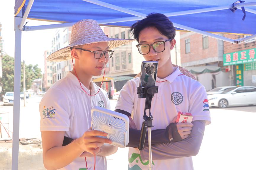 首先,队员们对墙面破损部分进行细致粉刷,让墙面恢复平整。随后,大家迅速分工:调色组专注调配出合适的色彩;打线稿的队员精心勾勒图案轮廓;摄影摄像队员负责记录精彩瞬间;直播队员则向直播间观众热情介绍云浮罗定生江镇特产,呼吁更多人加入振兴乡村的行列。