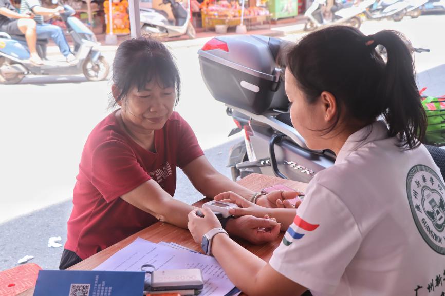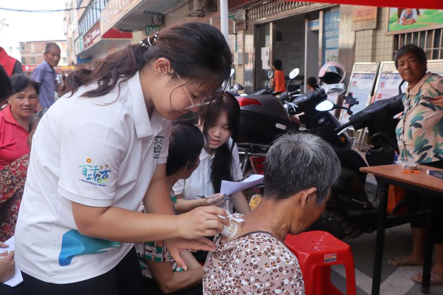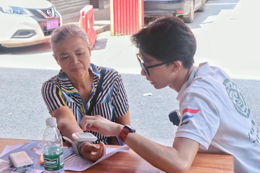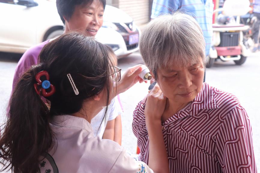 在义诊过程中,带队老师沈香香全程在旁悉心指导。她时刻关注队员们的操作,例如提醒队员们,给村民贴完艾灸贴后,务必告知老人在三到五个小时内将其撕下,以免老人皮肤因长时间受热而烧伤起水泡。沈香香老师不仅进行指导,还亲自参与到健康宣讲活动中,为老人测量血压,耐心细致地进行健康宣教,以专业的素养为活动的顺利开展保驾护航。