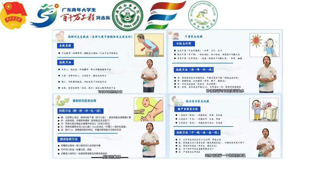 宿梦乡筑突击队在专业知识的基础上,努力学习新技术,包括视频剪辑技术、海报设计及计算机绘图技术。在活动期间,秉持开拓创新的精神,保持每日更新推文至少一篇;视频创作成果丰硕,既有可扫码观看的自行创作的永久性科普类视频,也有在特色民宿实景拍摄的情景剧类宣传视频。除此之外,团队用计算机绘图软件自行创作的海报成为亮眼名片,海报内容包含四项应急处理措施,搭配二维码,让外来游客与当地居民更直观了解并学习部分突发情况的应对方法,侧面提升了九龙民宿的独特竞争力。