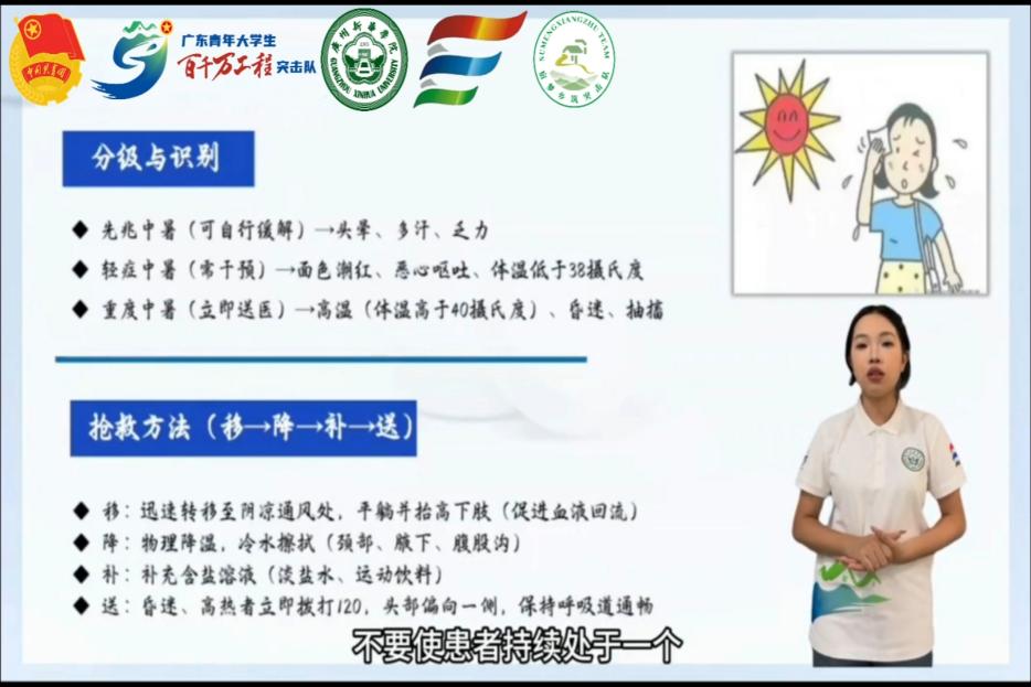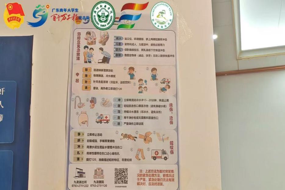 在不断的打磨中,最终形成了关于海姆立克急救法、烧烫伤处理方法、蛇咬伤应对措施及中暑的应急与防治的宣传海报。该海报版面设计中,含视频讲解,该视频从演示文稿到内容讲解,都是由突击队员们精心制作,最终以二维码形式在海报上呈现,此二维码永久有效,给镇上外来游客甚至当地居民,对学习以上四项应急知识有极大帮助,同时也体现了突击队员们对专业知识的应用。