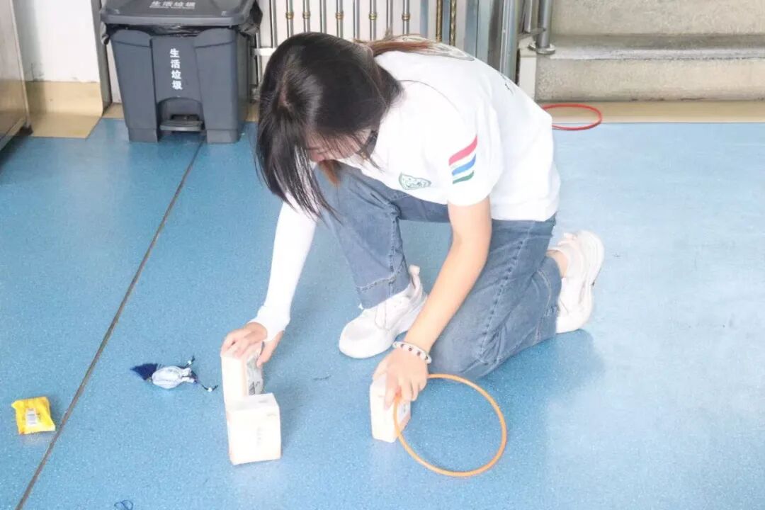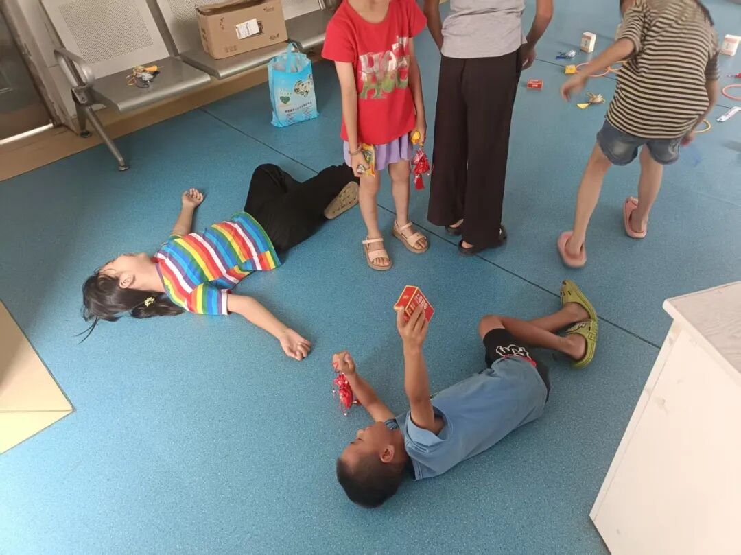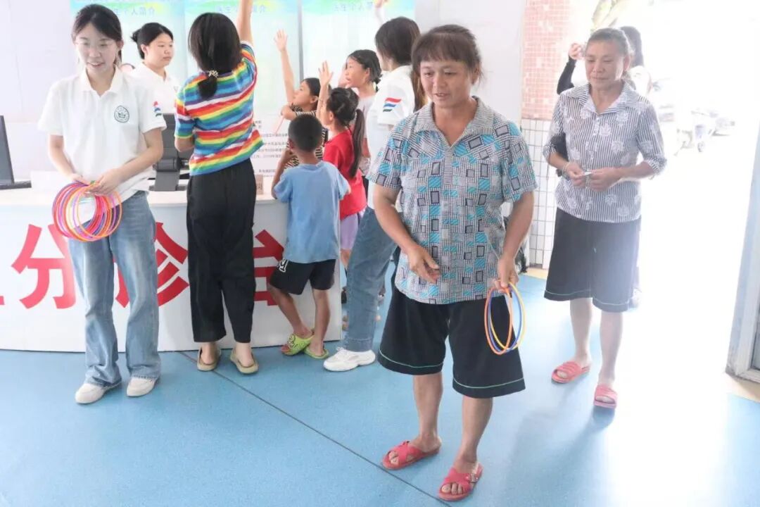 午后的阳光渐渐热起来,我们把互动区搬到了卫生院的室内,套圈游戏刚摆好,就围过来一群孩子。参与过义诊的村民都能领五个圈,地上的奖品不算贵重——牙刷、纸巾、香皂,还有我们亲手缝制的中药香囊,但孩子们的热情却格外高涨。