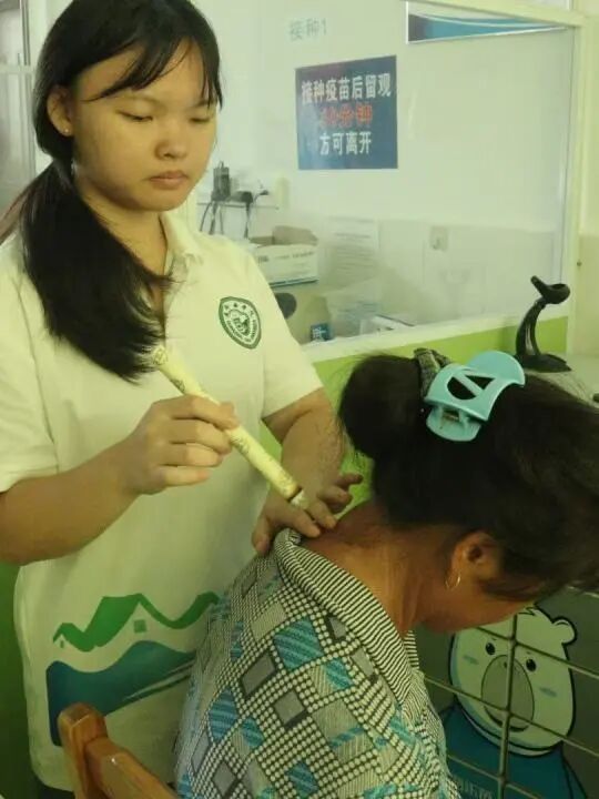 艾灸的青烟在晨光里袅袅升起,混着瑶乡特有的草木气息,竟有种特别的安宁感。负责艾灸的队员专注地调整着艾条与皮肤的距离,“温温热热的,真舒服,舒服得想睡觉了。”一位阿婆眯着眼睛说,她的脖子现在舒服多了。队员们告诉她平时有不舒服的也可以备点灸条,可以自己在家灸。