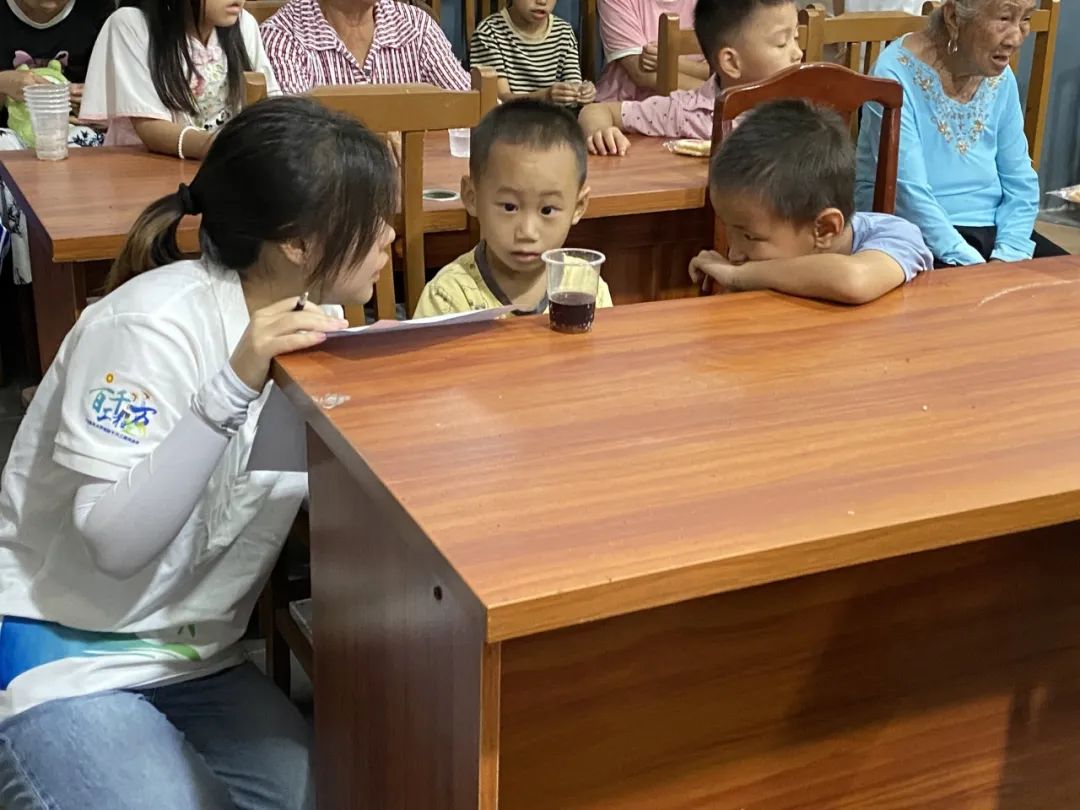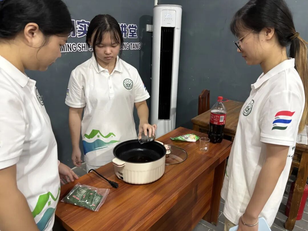 文化室内,隐形糖"实验展示将现场气氛推向高潮。随着加热锅中可乐逐渐蒸发,褐色的糖浆在锅底越积越厚,实验结束后,团队成员手持实验样品走到村民中间进行展示,让大家更直观地了解日常饮食中的"隐形糖"。现场村民纷纷表示惊讶。其中一个小朋友看着可乐检测结果惊讶地说:"原来我每天喝的饮料里有这么多糖!"团队成员并借此机会普及了合理膳食知识,推荐了健康饮食方案。