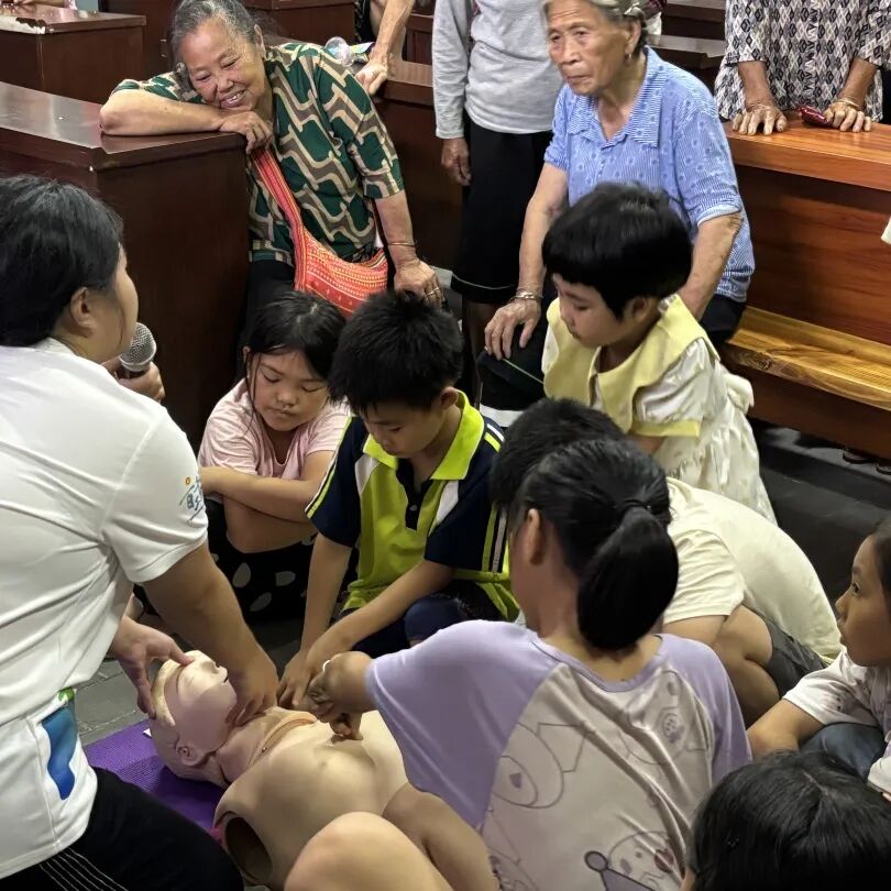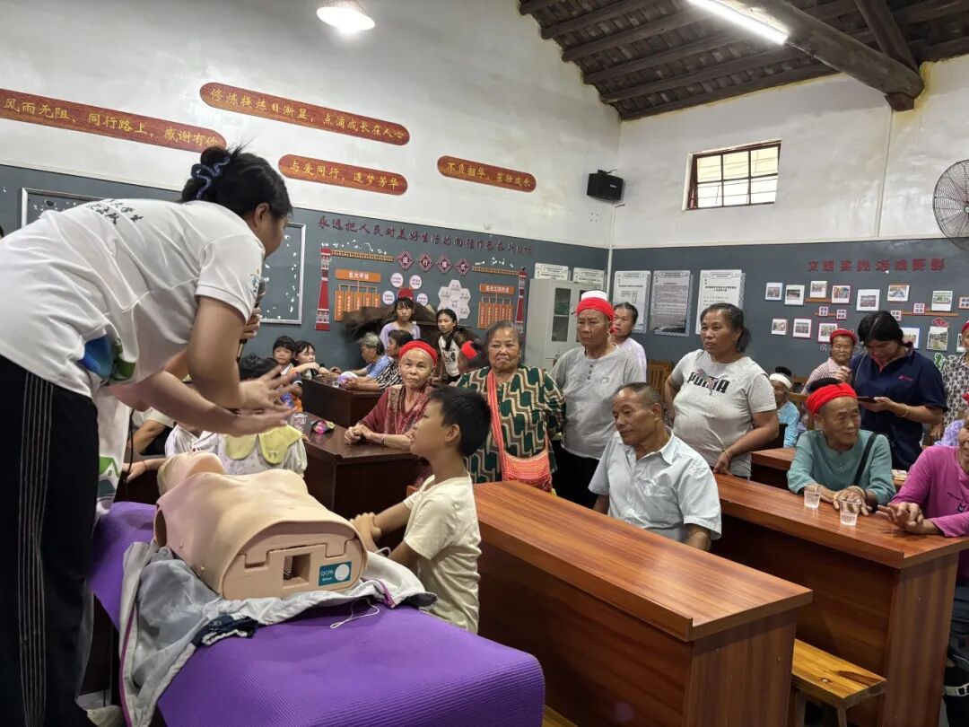 “手臂伸直,按压节奏是100-120次/分钟!”在 CPR(心肺复苏)教学环节,队员们利用人体模型,手把手指导村民学习急救技能。
