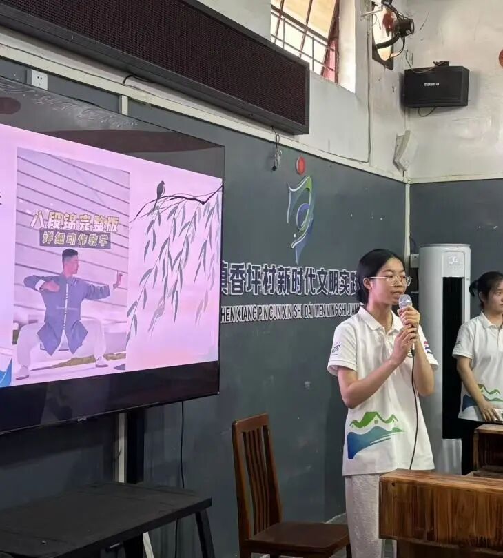 从“双手托天理三焦”的伸展上扬,到“调理脾胃须单举”的左右平衡,一招一式,皆蕴含着千年养生智慧。一开始,许多村民还有些放不开,但在我们的热情带动下,他们纷纷加入,跟随着口令认真练习。在这一招一式、一呼一吸间,八段锦不仅锻炼了大家的身体,更让传统文化在乡村落地生根。