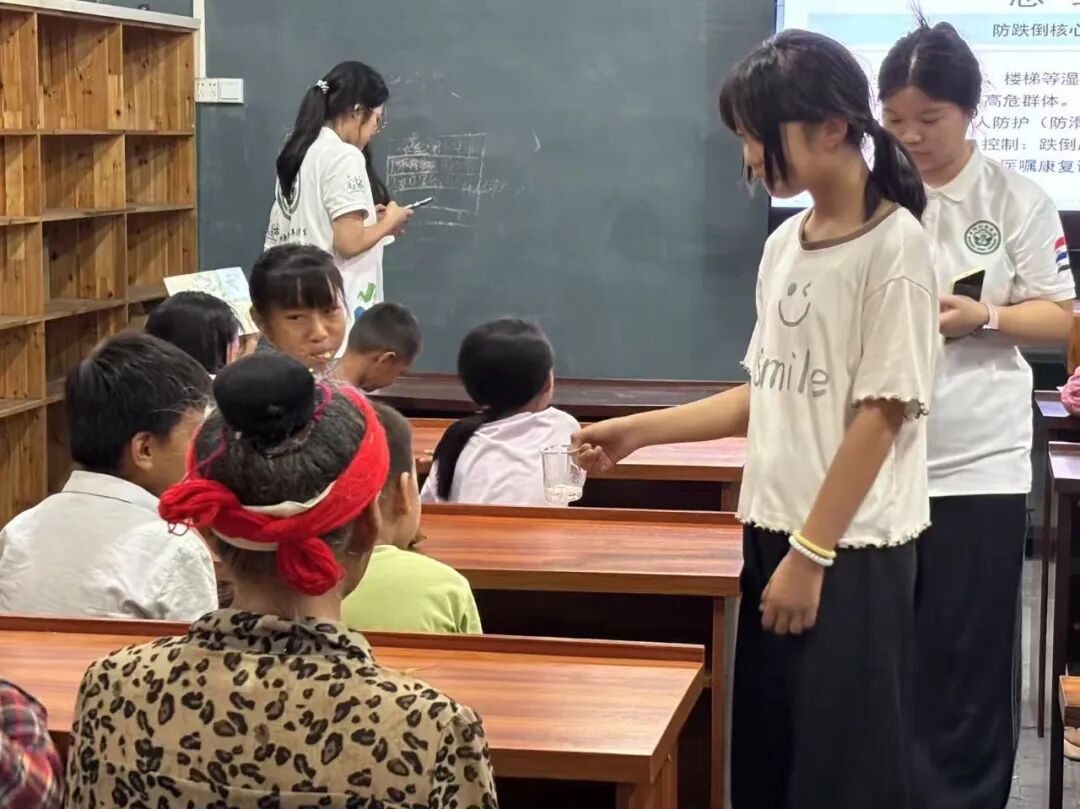 此外,宣讲员还会让孩子们亲自动手做实验,让孩子们慢慢倒入适量白醋,边倒边搅拌,会看到水中逐渐冒出小气泡,随着反应进行,杯底会慢慢出现一些白色的细小沉淀,让他们在实践过程中感受到实验的奥秘与乐趣。