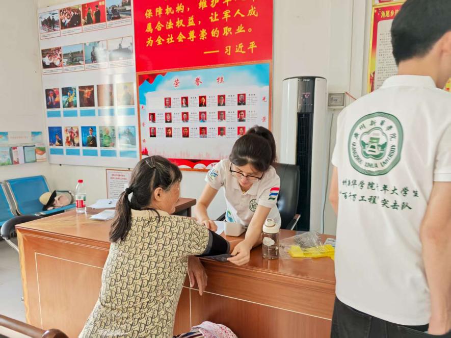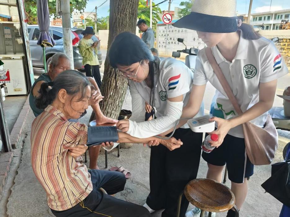 7 月 14 日,广州新华学院护理学院星火行动突击队继续在角尾乡许家寮村开展三下乡服务。碧海环绕的村落里,队员们带着血压计、血糖仪和健康问卷,用一次次细致的测量与耐心的询问,将健康关怀送进乡亲们的心坎里。