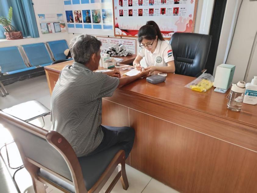 村委会一楼大厅早早摆开了服务台,血压仪、血糖试纸整齐排列。"阿伯,袖子卷起来一点,我给您测个血压",队员们一边熟练操作仪器,一边轻声安抚紧张的老人。指尖采血时特意放缓动作,报出数值后仔细叮嘱注意事项:"阿姨您血糖稍微有点高,平时少吃点甜食。