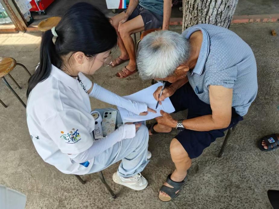 树荫下的石凳成了临时问诊点,队员们的队服早已被汗水浸湿,却依旧耐心十足。"小姑娘,我这血压是不是比上次降了点?" 村民主动分享身体变化的样子,让队员们倍感欣慰。填问卷时,一位大爷拉着队员的手说:"你们不光给我们量身体,还问我们吃啥、睡得好不好,比亲人还周到"。