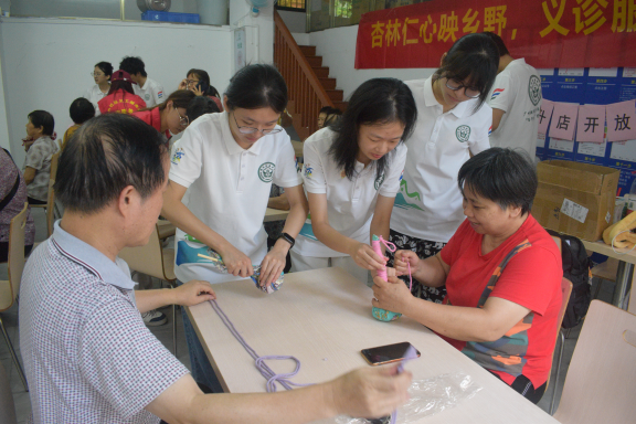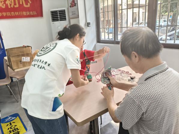 在示范教学环节,队员们手持材料分步操作,从艾叶的均匀铺展、棉布的精细卷裹,到麻绳的螺旋缠绕,每一个步骤都进行细致拆解。老人们在专业指导下专注投入,布满岁月痕迹的双手认真配合,经过近一小时的精心制作,兼具实用性与观赏性的艾草锤逐一诞生。制作完成后,队员们运用中医推拿理论,为老人们进行肩颈等部位的专业捶打护理,并现场教学基础保健手法,将中医养生知识转化为便于掌握的日常保健技能。