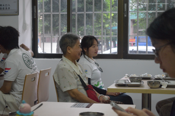 华灯初上时,“长者饭堂”内飘来阵阵诱人的饭菜香气。当日餐食包含芹菜炒肉、滑蛋、水煮青菜、冬瓜汤四道精心搭配的营养菜肴,既符合本地饮食特色,又兼顾营养均衡与软烂适口的需求。就餐过程中,队员们主动协助行动不便的老人就座,细致询问饮食需求并及时添菜盛汤。