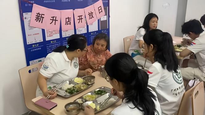 围坐餐桌前,两代人展开亲切交流,从城市发展变迁谈到健康养生知识,现场氛围温馨融洽。谈及对“长者饭堂”的感受,一位老奶奶难掩喜悦之情:“这里不仅解决了独居老人的就餐难题,更重要的是每天能吃到新鲜热乎的饭菜。食堂根据我们老年人的口味调整菜谱,少油少盐又不失风味,荤素搭配合理,连汤品都是每日更换,真正做到了营养全面。”质朴的话语中,饱含着奶奶对“长者饭堂”的高度认可。