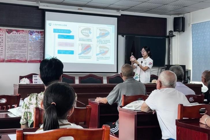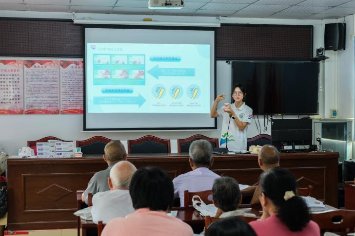 不到九点,党群服务中心的座椅已所剩无几。满头银发的老人们或拄杖而来,或由家人搀扶入座,不少人手中握着纸笔,镜片后的目光里满是期待。“人老了,牙齿先‘老’,就盼着懂行的人来讲讲门道。”72岁的周大爷轻轻摩挲着笔记本,道出了大家的心声。队员们以一句“咱们今天不说术语,只聊护牙的实在招”开场,乡音里的亲切瞬间消弭了距离,现场的气氛愈发轻松起来。