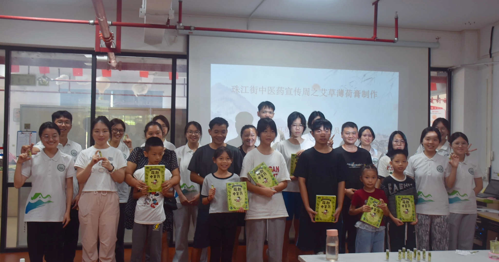 在队员们的看护和指导下,孩子顺利完成了艾草薄荷膏的制作。他们兴奋地将亲手制作的成果装入塑胶袋并配上卡片收好。最后,社区工作人员向每位孩子赠送了《萌趣中草药漫画书》,鼓励他们了解中医药文化。