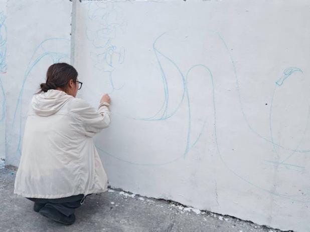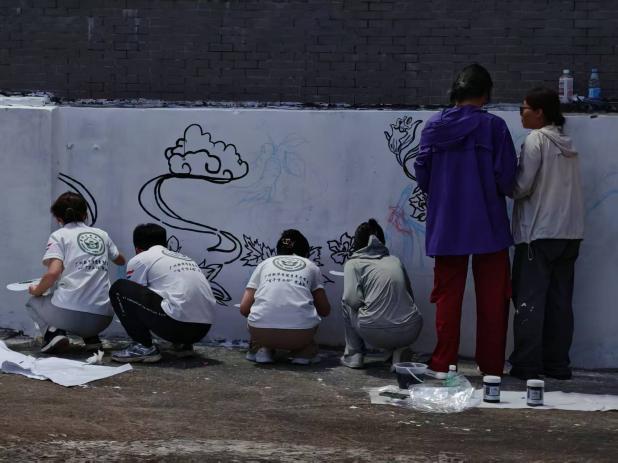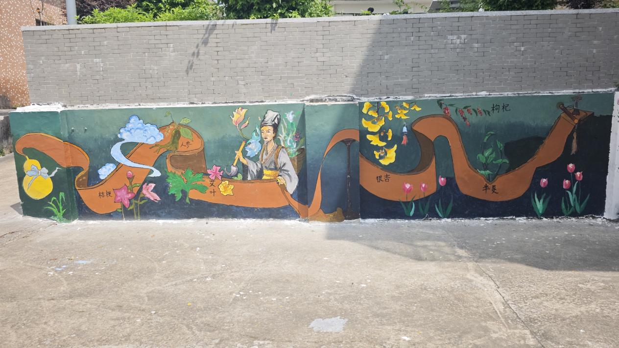 7月16日起,墙绘进入创作阶段。美术组的两名队员李宣霖和高晓燕率先用粉笔勾勒轮廓,从半夏、艾草等常见药草到《本草纲目》中的经典图谱,一步步将中医药文化元素转化为生动的视觉符号。其余队员则分工参与描边和丙烯上色,鲜艳的色彩在墙面上逐渐铺展。