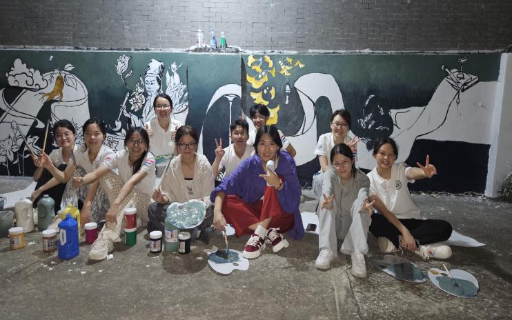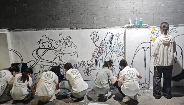 至18日,墙绘主体部分已基本完成,仅剩局部上色和细节调整。当日下午,王秀岚院长亲临现场慰问。在参观墙绘作品时,看到以中医药文化为主题的创作,院长结合《黄帝内经》“用之充饥则谓之食,以其疗病则谓之药”的记载,谈起药食同源理念在国人健康追求与文化传承中的价值 。院长援引经典,鼓励青年学子传承“药食同源”这类中华优秀传统文化,这让队员们对习近平总书记在中共中央政治局就我国历史上的国家治理第十八次集体学习时所说的“我们不能数典忘祖,妄自菲薄……中华优秀传统文化是我们最深厚的文化软实力,也是中国特色社会主义植根的文化沃土”有了更深的体会和感悟。