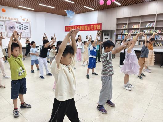 绘画活动结束后,紧接着由队员李梓晗和梁汶韬开展五禽戏的教学。他们向小朋友们展示并详细解说五禽戏每一式动作,其他队员则负责维持现场秩序。此次活动教授小朋友们五禽戏里的所有动作及其知识。活动尾声,小朋友们在队员指导下完整演练五禽戏,一招一式虽显稚嫩却充满童趣与活力。此次教学不仅有助于促进儿童身心健康,还让他们在实践中掌握养生方法、增强健康意识,更在亲身体验中感受传统文化的深厚底蕴,传承了中华优秀传统文化。