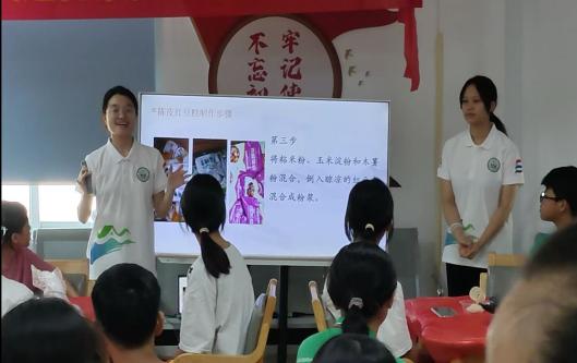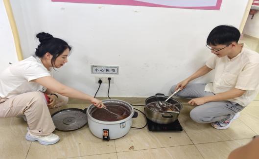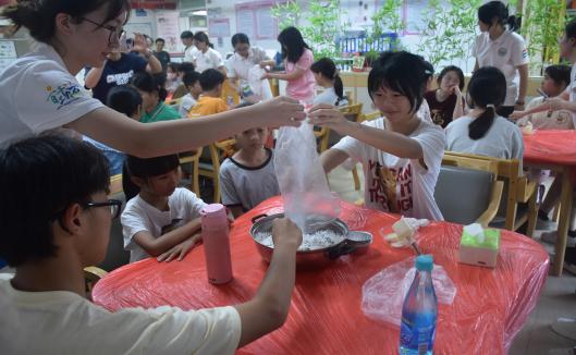 7月15日下午,云岫岐黄突击队师生们走进广州市南沙区珠江街道颐康中心为青少年们带来了一场以制作陈皮红豆糕、开展五禽戏教学及趣味讲解中医药小故事为主要内容的中医药文化实践活动。队员们提前到达活动场地,预先清洗碗盆,准备好活动所需的材料,并提前5小时浸泡红豆,刮去陈皮白囊。为熬制红豆沙做足准备,确保活动的顺利开展。