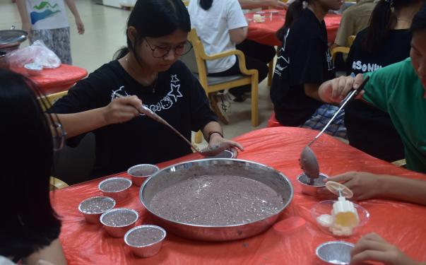 随后,云岫岐黄突击队的队员们将陈皮红豆沙、锡纸杯、模具和混合好的材料分布至各桌整齐摆放。待青少年有序就座,活动便正式开始了。