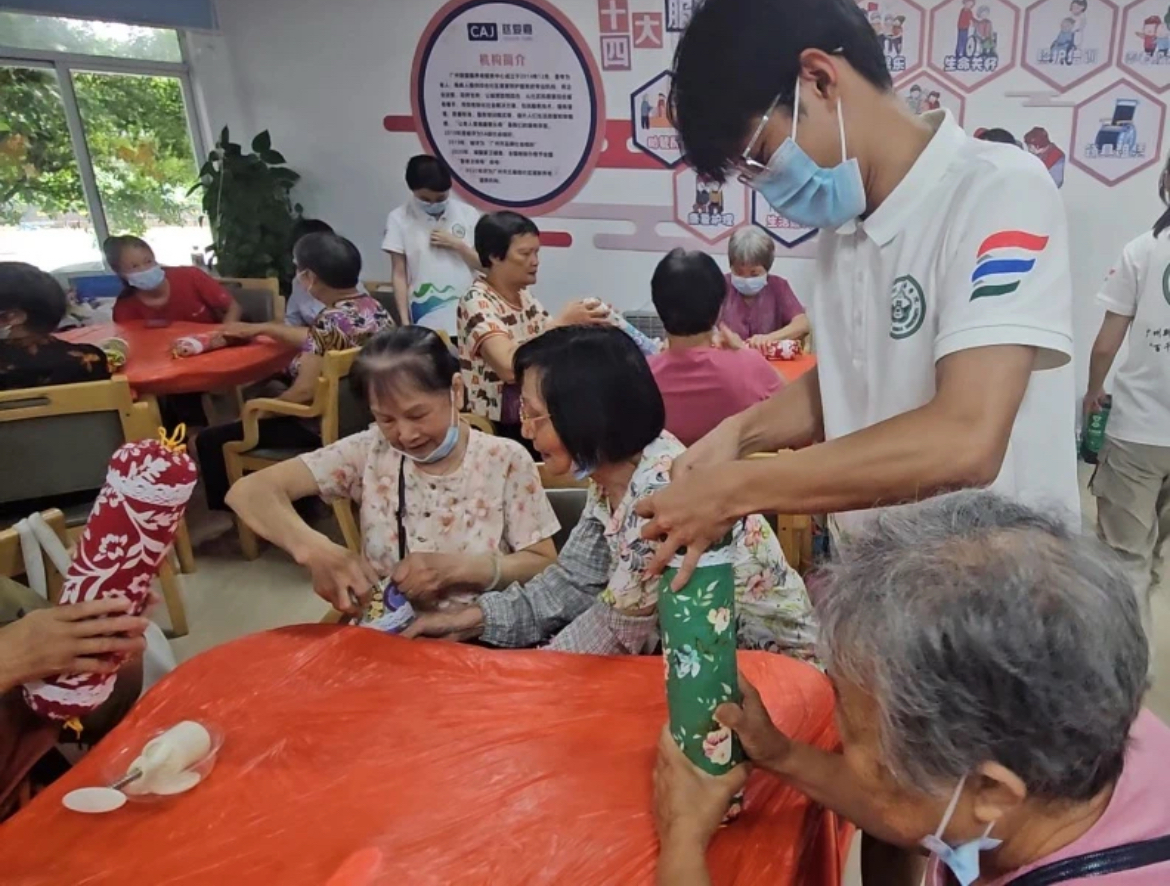 期间,有长者们询问艾草的功效,队员们热情解答,还科普了艾草清热解毒、驱蚊虫的作用。针对长者关心的清洗问题,队员也对其进行了解释:外枕套可拆洗,内胆中的艾草晒干后能重复使用,方便实用,老人们在操作过程上遇到困难,队员们便迅速上前协助,现场互动氛围热烈,老人乐在其中。
