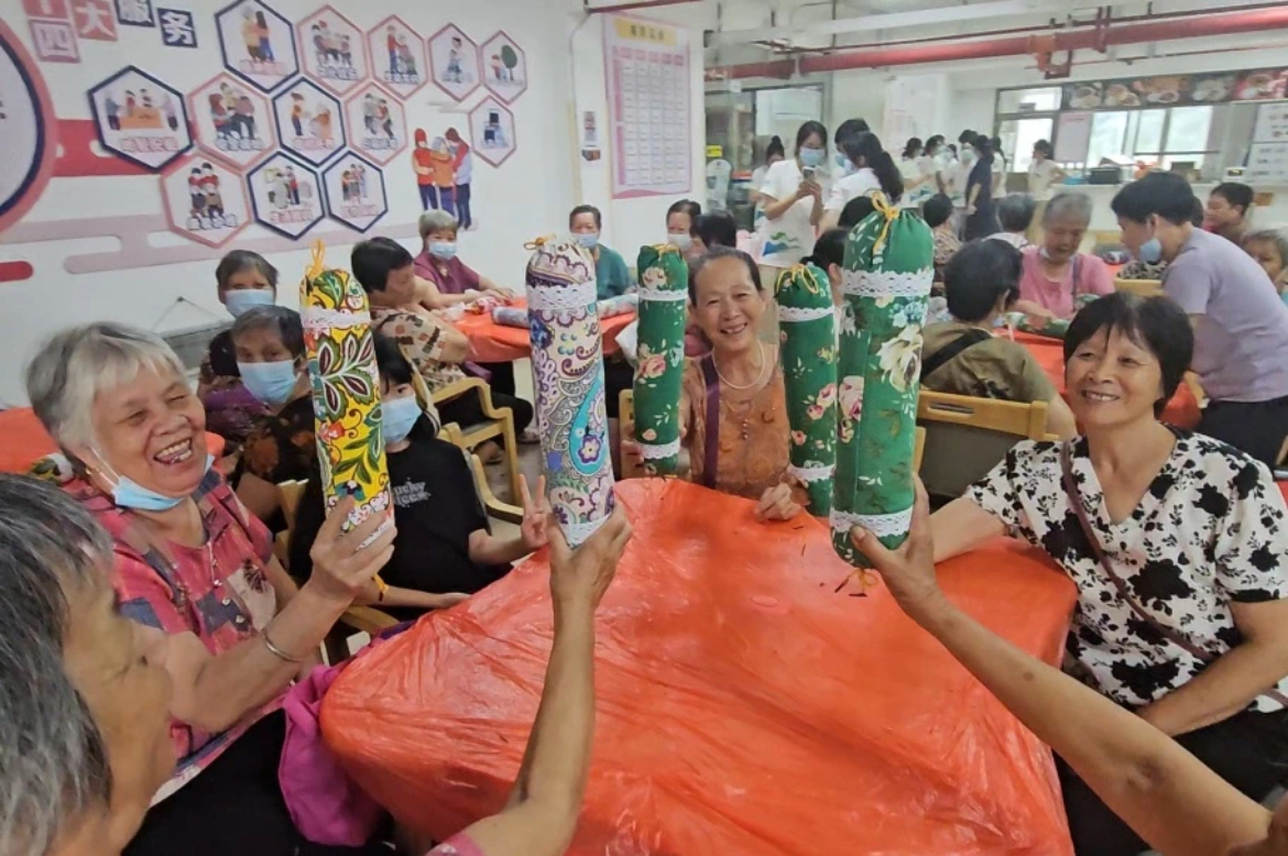 随着一把把艾草被小心翼翼地填充进去,承载着满满心意的艾草枕也初具雏形。看着自己亲手制作的成果,长者们脸上洋溢着灿烂的笑容,纷纷自豪地展示着。