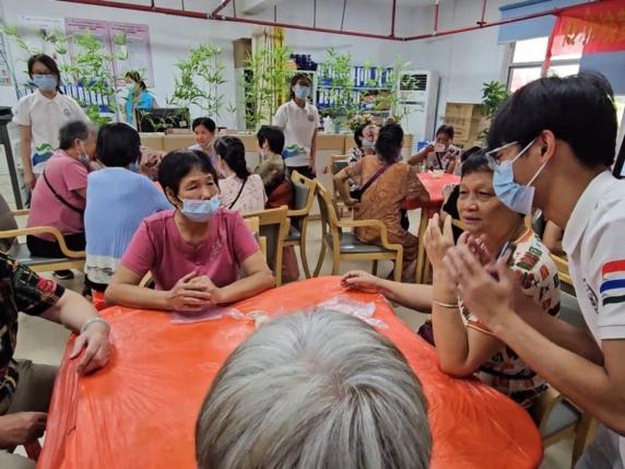 活动伊始,云岫岐黄突击队队员冯绮雯、梁汶韬利用亲民的粤语结合PPT讲解陈皮红豆糕制作方法,长者们自己动手称量所需的各类面粉并充分混合均匀。紧接着,在队员们的指导下,有序完成后续步骤。装入锡纸杯后,队员帮助老人们将其放入蒸锅。
