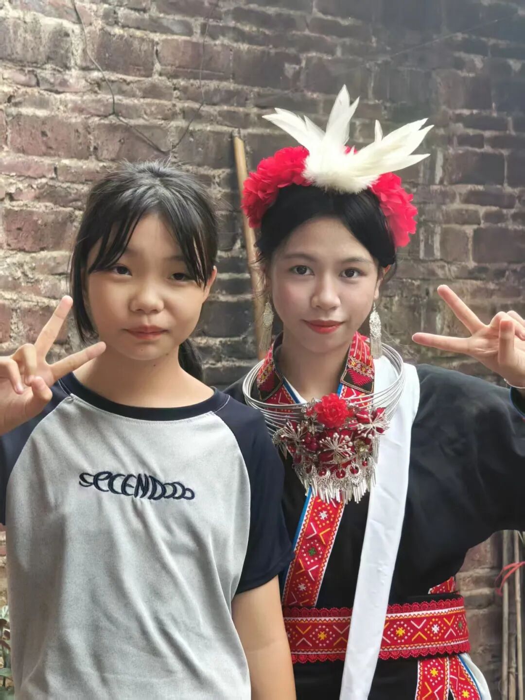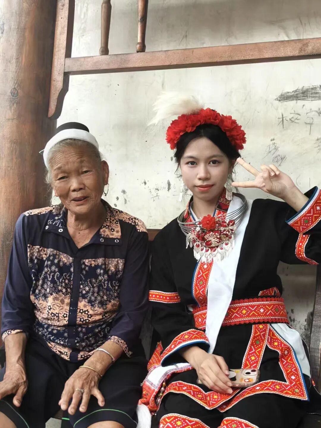 老奶奶看着队员们穿上衣服的样子,脸上洋溢着骄傲的笑容。她用不太流利的普通话告诉我们,这些衣服是她年轻时的作品,每一针每一线都倾注了她的情感。她还说,瑶族的服饰是瑶族文化的重要组成部分,她会坚定地传承下去,让火种永不熄灭。