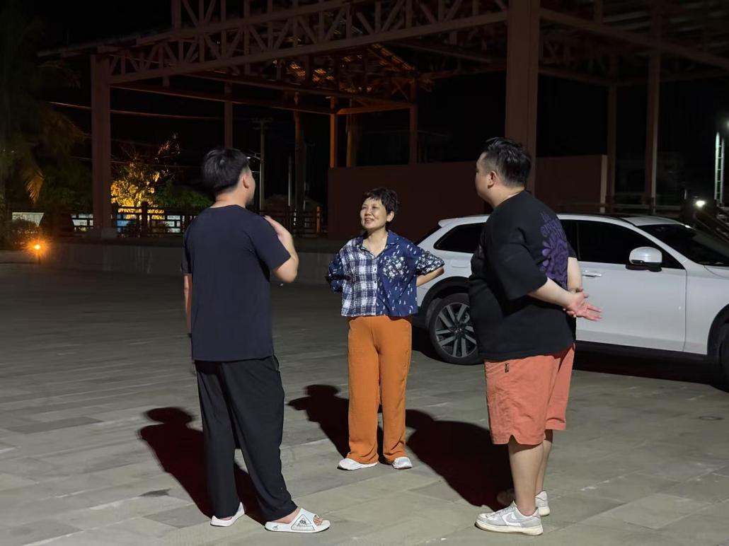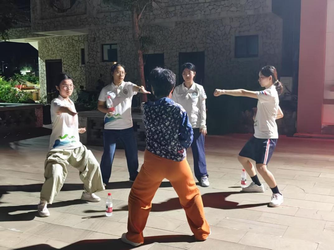 队员们也散开,拉起身边的老人:李大爷膝盖不便,就教他简化版的腿部动作;小宇的奶奶眼神不好,队员便轻握她的手带她感受发力 —— 场地上,口令声、拐杖点地声、老人的笑声混着海风,成了夜里最温柔的调子。