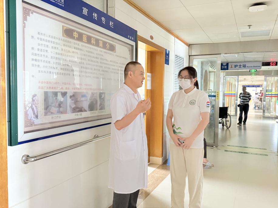 广州新华学院锦绣高凉突击队(以下简称“突击队”)于7月14日前往高州市人名医院,专访中医科主任谢懋华。本次专访主要围绕着探究“中西医结合治疗在临床上的应用”于“中西医结合治疗的优势”展开。在访谈过程中,谢主任结合医院科室情况,从实际出发,分析中西医结合的核心差异和优势,为突击队后续的成果转化提供了新思路。