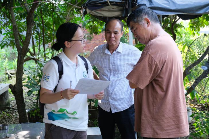 三个小分队采取随机入户等方式开展调研。其中,在光镇村,队员们寻找当地党群服务中心负责人帮助,两位负责人带着队员们一起走访村民家中进行调研。天气炎热,走访期间,队员们向两位负责人的协助表示感谢,他们笑笑摆摆手说:“没关系,能帮到你们就好,我们这个地方是乡下,人比较少,大家互相帮助就好。”基层党员负责人的支持给队员们的调研带来了极大的帮助,也给突击队队
