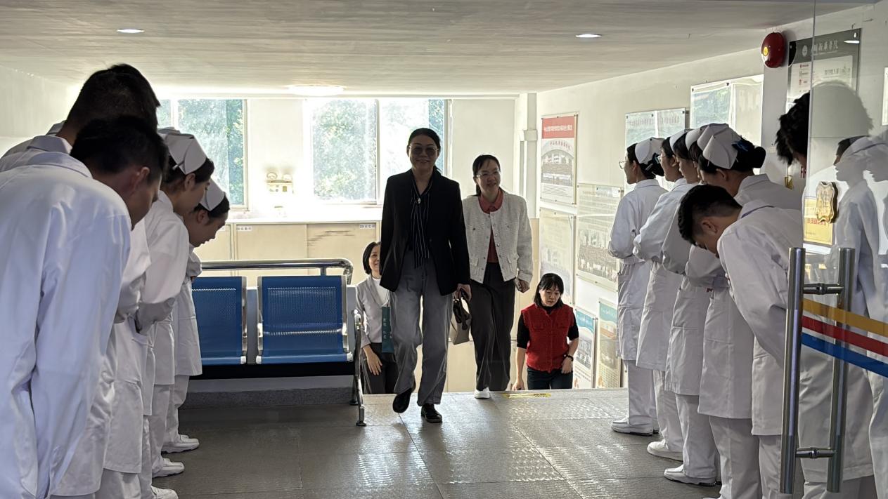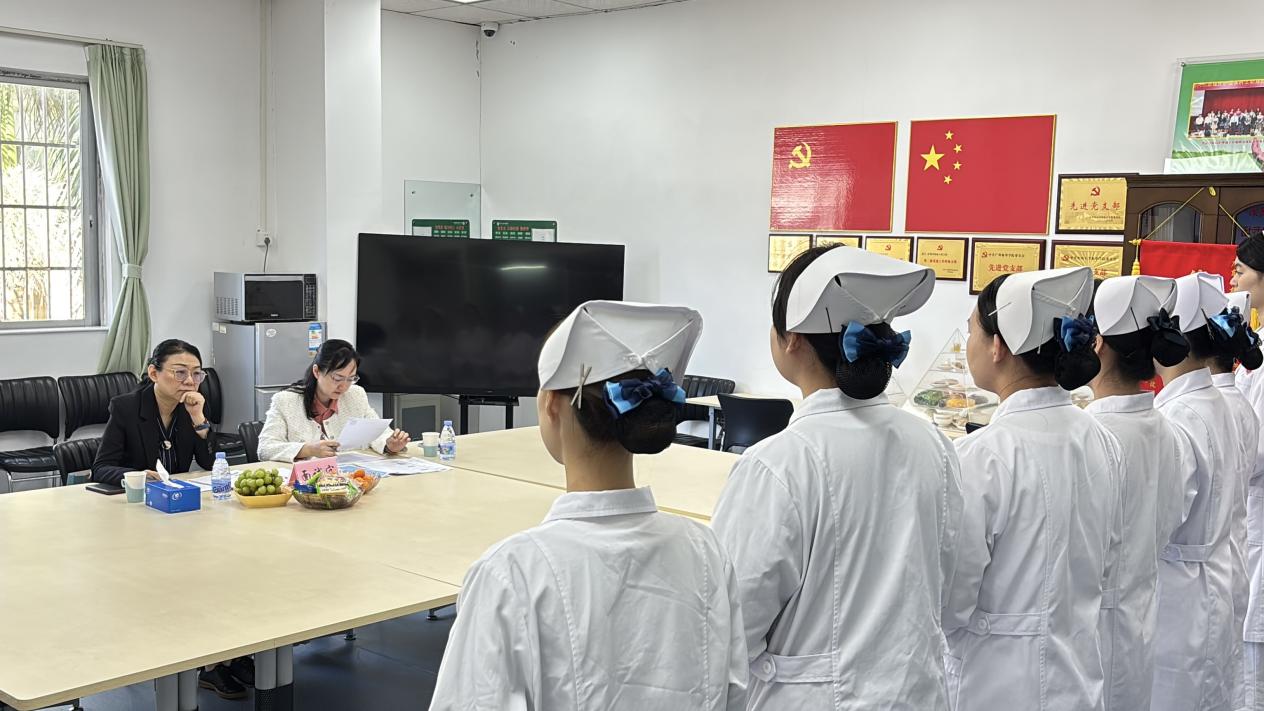广药大附一院护理部周晓舟主任、梁云芳副主任,在护理学院王秀岚院长、黄洛莹副院长的热情陪同下,走进护理学院实验实训中心。等候已久的同学们带着期待与热忱列队欢迎,用饱满的精神面貌开启本次面试交流的序幕。
