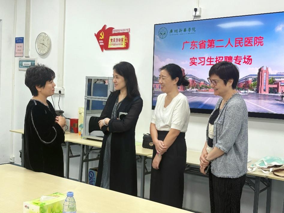 2025年11月7日,广东省第二人民医院护理部副主任护师陈鸾、主任护师郑文、主任护师刘玲如期到达广州新华学院护理学院,开展2023级本科生实习招聘面试,护理学院王秀岚院长及学院师生对三位老师的到来表示热烈欢迎。