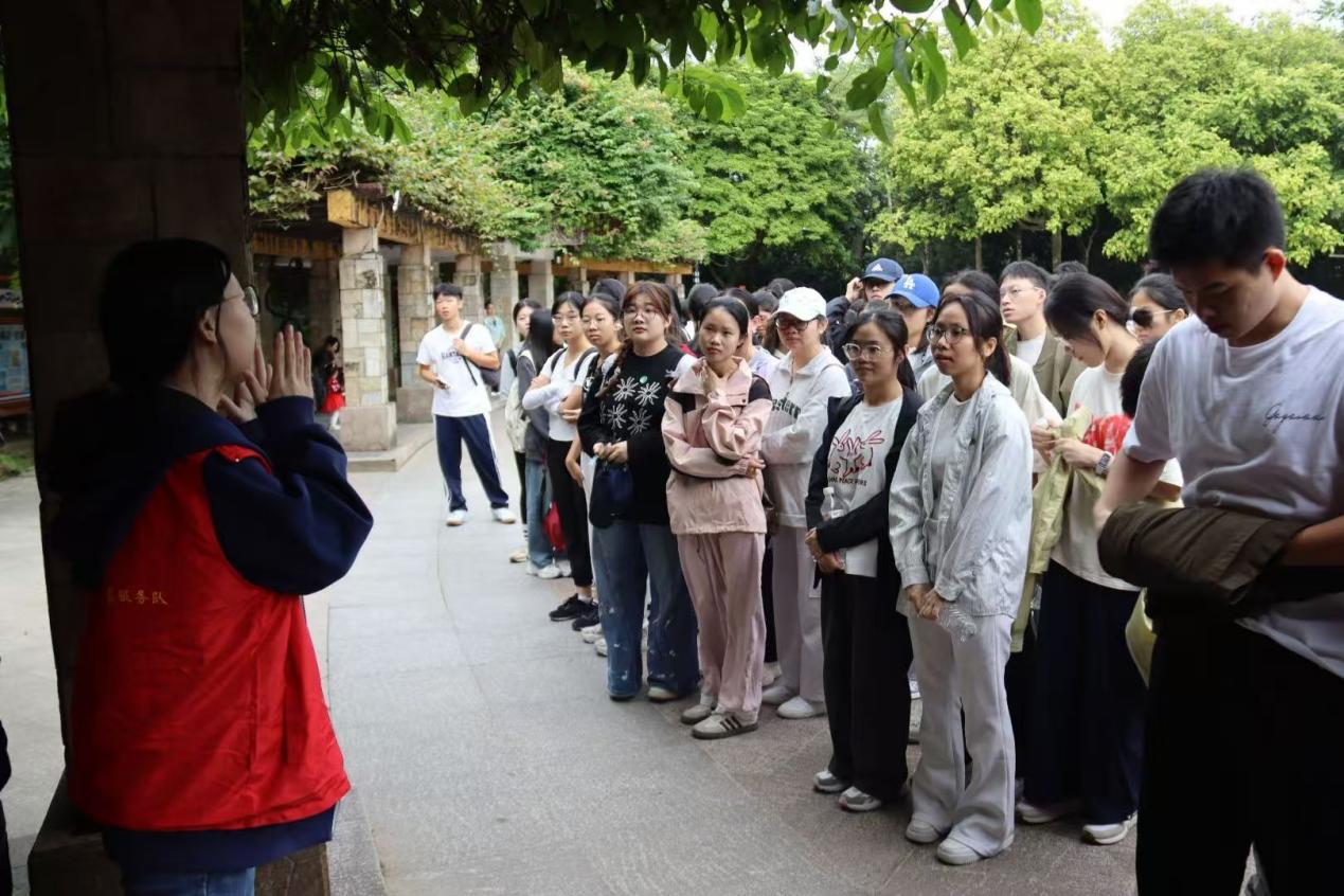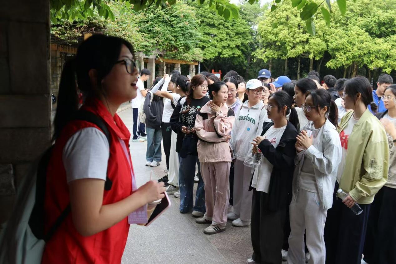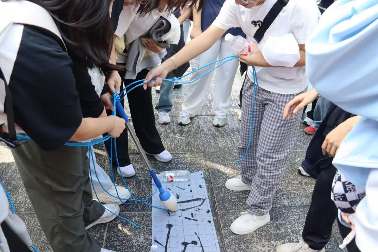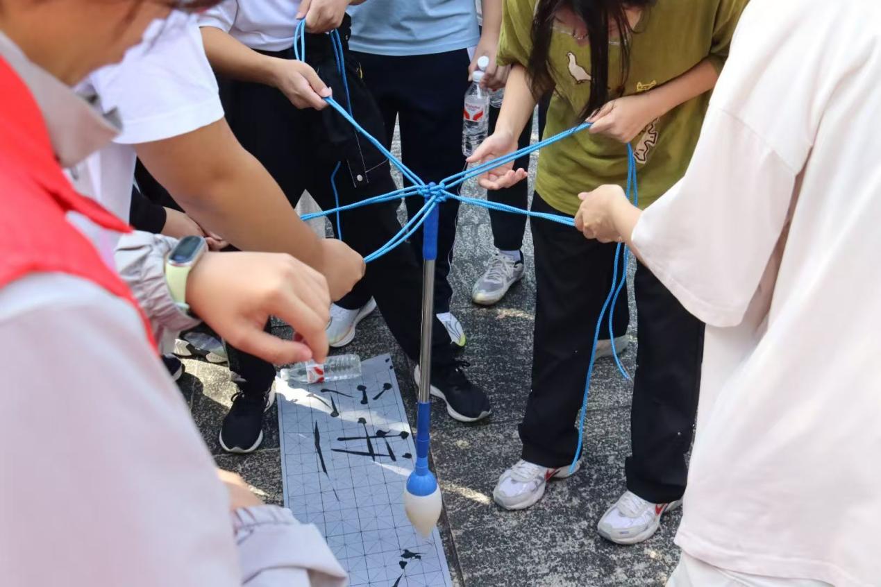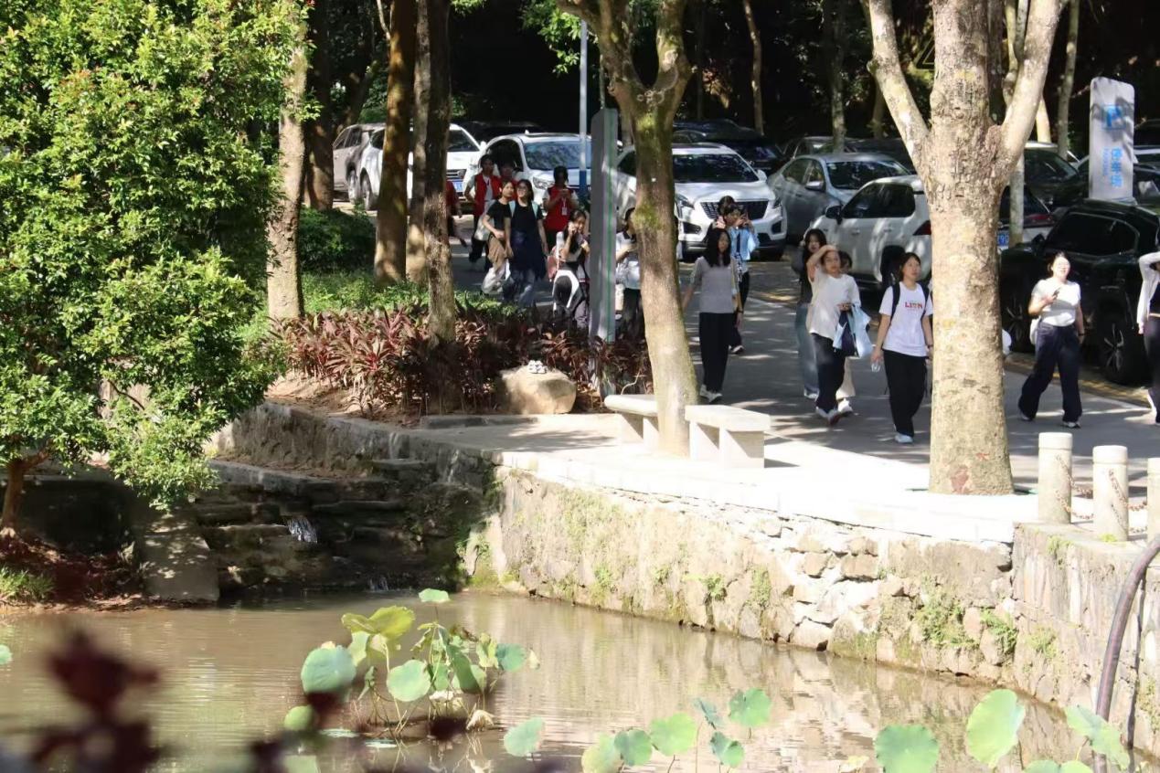热身结束后,各小组结伴登山,途中遵循“安全第一、结伴而行”原则。休息点处,志愿者及时提供补给并指引方向;荷花池附近“神笔马良”游戏区,两组志愿者引导各小组协作拉绳,书写“奉献”“互助”等志愿口号,用时最短队伍斩获团队章。攀登途中,师生相互扶持、彼此鼓励,在欣赏山野风光的同时,深化了团队信任与责任担当。