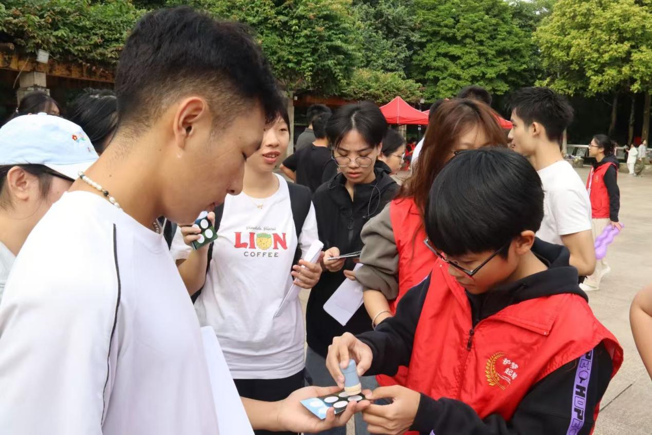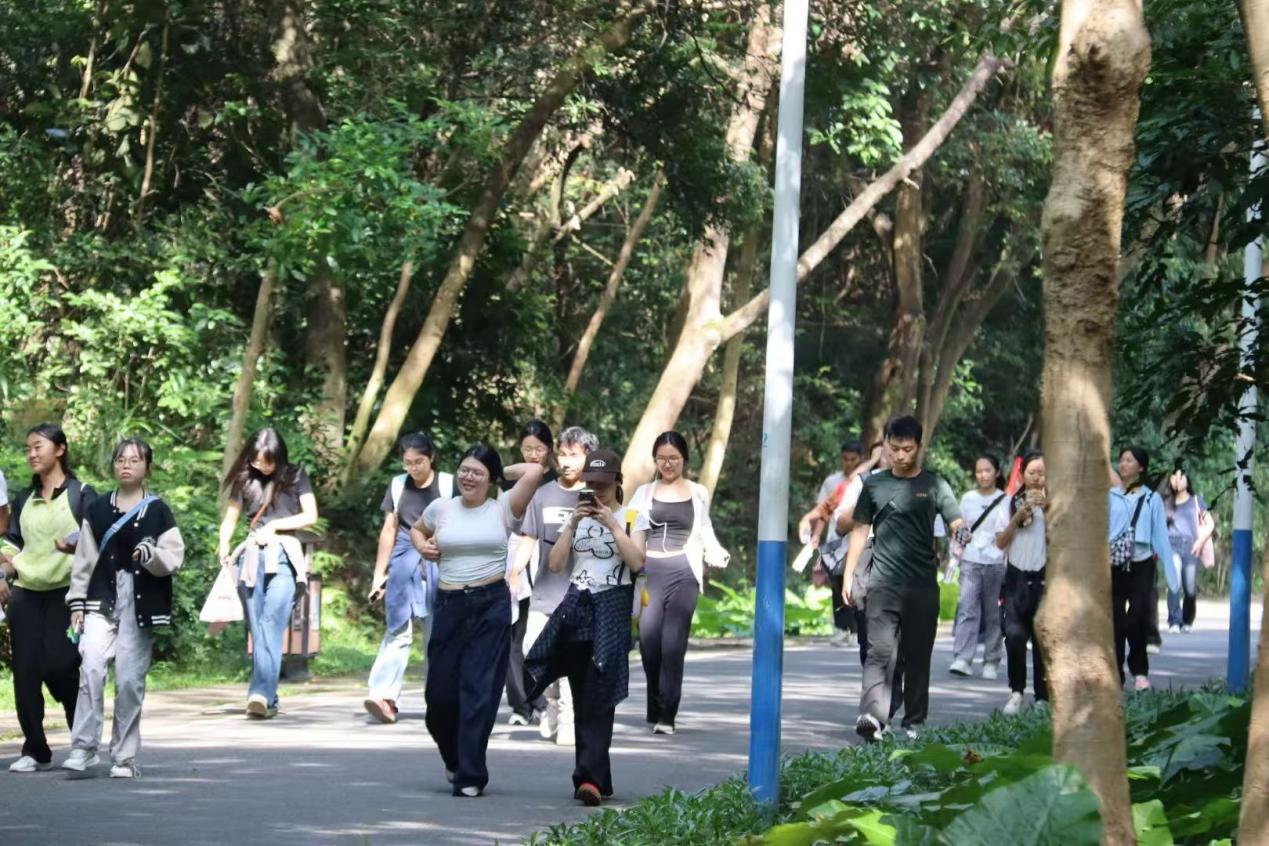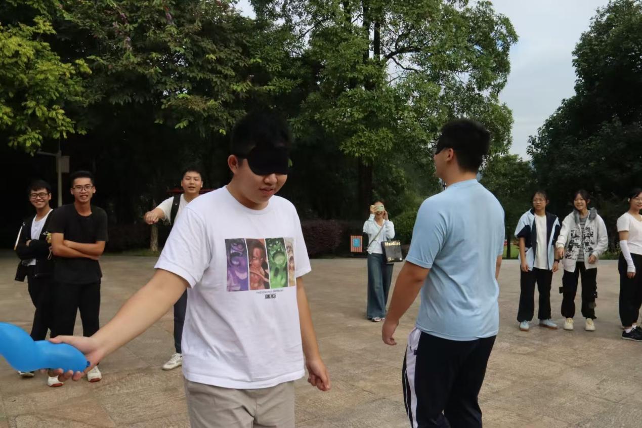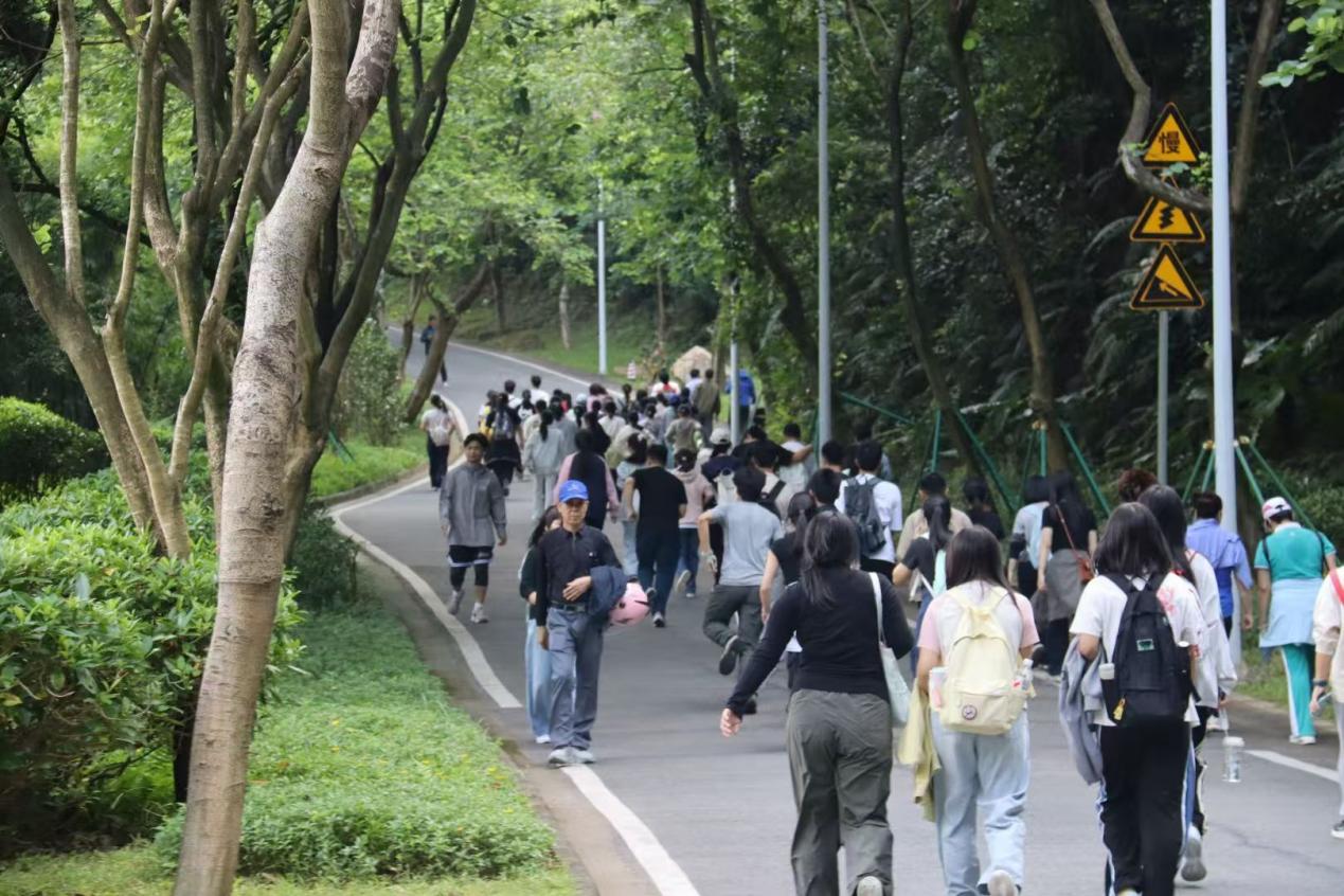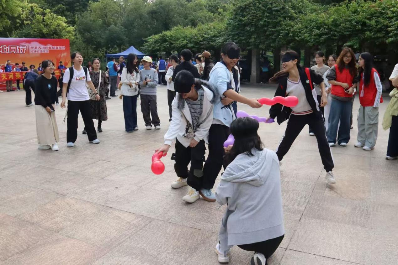 上午8时,参与师生准时在A栋架空层集合,志愿者有序分发矿泉水与活动卡片,细致讲解登山路线及安全注意事项。全员集结后,队伍统一前往凤凰台开启热身环节。“撕名牌”中队员灵活攻防、团队联动,“盲人剑客”凭队友语音指引精准出击。各游戏点志愿者分工明确,分别负责规则讲解、计时记录、秩序维护与盖章,完成游戏的小组均获团队章,为登山环节夯实协作基础。