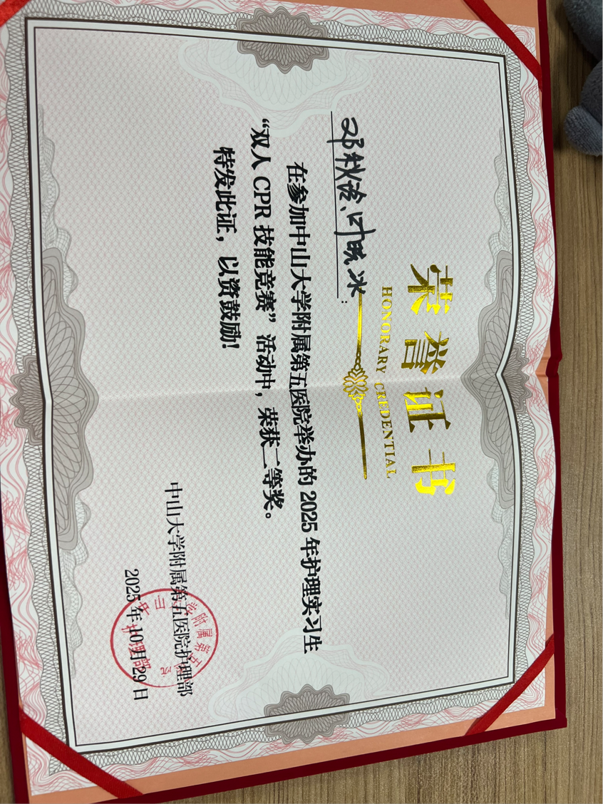 2025年10月29日,中山大学附属第五医院护理部举办护理实习生双人CPR(心肺复苏)竞赛。我校邓秋玲、叶晓冰同学在竞赛中凭借出色表现,荣获第二名!其指导老师——外科ICU何松津(我校2020届师兄)荣获“优秀指导老师”称号。